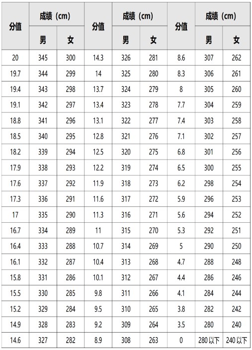 成績(jī)(米) | 分值 | 成績(jī)(米) | 分值 | 成績(jī)(米) | 分值 | 成績(jī)(米) | 分值 |