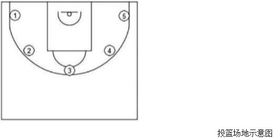 Ⅸ、籃球考核內(nèi)容及評(píng)分標(biāo)準(zhǔn) (一)考核內(nèi)容 1.助跑摸高(20分) 2.1分鐘自投自搶投籃(20分) 3.多種變向運(yùn)球上籃(20分) 4.實(shí)戰(zhàn)能力(40分) (二)考核標(biāo)準(zhǔn) 1.專項(xiàng)素質(zhì) 摸高 (1)考試方法:考生助跑起跳摸高,單手觸摸電子摸高器或有固定標(biāo)尺的高物,記錄絕對(duì)高度。助跑距離和起跳方式不限。每人測(cè)試2次,取最好成績(jī)(精確到厘米)。 (2)評(píng)分標(biāo)準(zhǔn): (二)專項(xiàng)技術(shù) 投籃 (1)考試方法:如圖所示,在以籃圈中心投影點(diǎn)為圓心,5.5米為半徑所劃的弧線上設(shè)置五個(gè)投籃點(diǎn)(球場(chǎng)兩側(cè)0度角處、兩側(cè)45度處和正面弧頂),每個(gè)點(diǎn)位放置5個(gè)球,共25個(gè)球??忌殢牡?投籃點(diǎn)或第5投籃點(diǎn)開始投籃,按逆時(shí)針或順時(shí)針?lè)较蛞来瓮锻昝總€(gè)點(diǎn)位的5個(gè)球。測(cè)試時(shí)間為1分鐘。要求考生必須在弧線外投籃,球出手前雙腳不得踩線,若踩線投中則計(jì)為無(wú)效投籃,不得分。每人測(cè)試2次,取最好成績(jī)。 (2)評(píng)分標(biāo)準(zhǔn):每投中1球,得1分,投中20球(含)以上為滿分20分。
