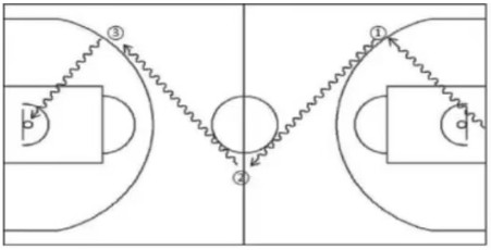 (1)考試方法:如圖所示,考生在球場(chǎng)端線中點(diǎn)外出發(fā)區(qū)持球站立,當(dāng)其身體任意部位穿過(guò)端線外沿的垂直面時(shí)開始計(jì)時(shí)??忌糜沂诌\(yùn)球至①處,在①處做右手背后運(yùn)球,換左手向②處運(yùn)球,至②處做左手后轉(zhuǎn)身運(yùn)球,換右手運(yùn)球至③處,在③處做右手胯下運(yùn)球后右手上籃。球中籃后方可用左手運(yùn)球返回③處,在③處做左手背后運(yùn)球,換右手向②處運(yùn)球,在②處做右手后轉(zhuǎn)身運(yùn)球,換左手向①處運(yùn)球,在①處做左手胯下運(yùn)球后左手上籃。球中后做同樣的動(dòng)作再重復(fù)一次,最后一次上籃命中后,持球沖出端線,考生身體任意部位穿過(guò)端線外沿垂直面時(shí)停止計(jì)時(shí),記錄完成的時(shí)間。每人測(cè)試2次,取最好成績(jī)。