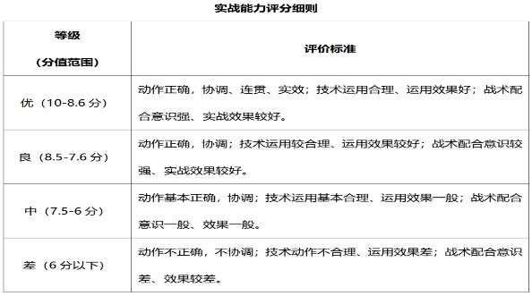 2.評(píng)分標(biāo)準(zhǔn):考評(píng)員參照實(shí)戰(zhàn)能力評(píng)分細(xì)則。獨(dú)立對(duì)考生動(dòng)作的正確、協(xié)調(diào)、連貫程度,技、戰(zhàn)術(shù)運(yùn)用水平以及配合意識(shí)等方面進(jìn)行綜合評(píng)定。采用10分制評(píng)分,分?jǐn)?shù)至多可到小數(shù)點(diǎn)后1位。
