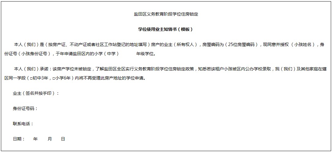 ④非自有產(chǎn)權(quán)房的須提供由業(yè)主簽字并按手印同意的《學(xué)位使用業(yè)主知情書》。非自有產(chǎn)權(quán)房的鹽田戶籍申請人且在鹽田區(qū)實際居住的,無法提供《學(xué)位使用業(yè)主知情書》的,需簽署《學(xué)位申請服從調(diào)劑承諾書》,由區(qū)教育局在全區(qū)范圍內(nèi)統(tǒng)籌學(xué)位?!秾W(xué)位使用業(yè)主知情書》模板如下。