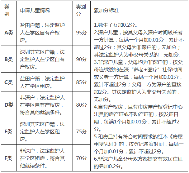 1.類別分:按申請兒童戶籍和監(jiān)護人住房情況,劃分為A、B、C、D、E、F六個學位申請類別。分類辦法及對應分值見《鹽田區(qū)義務教育階段學校申請人入學積分表》(以下簡稱《積分表》)。
