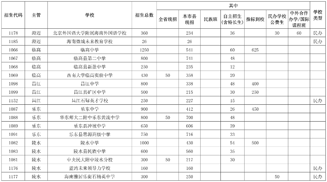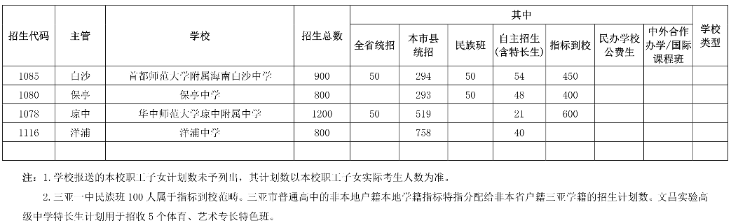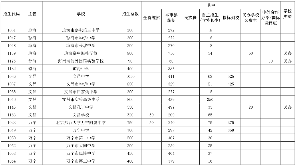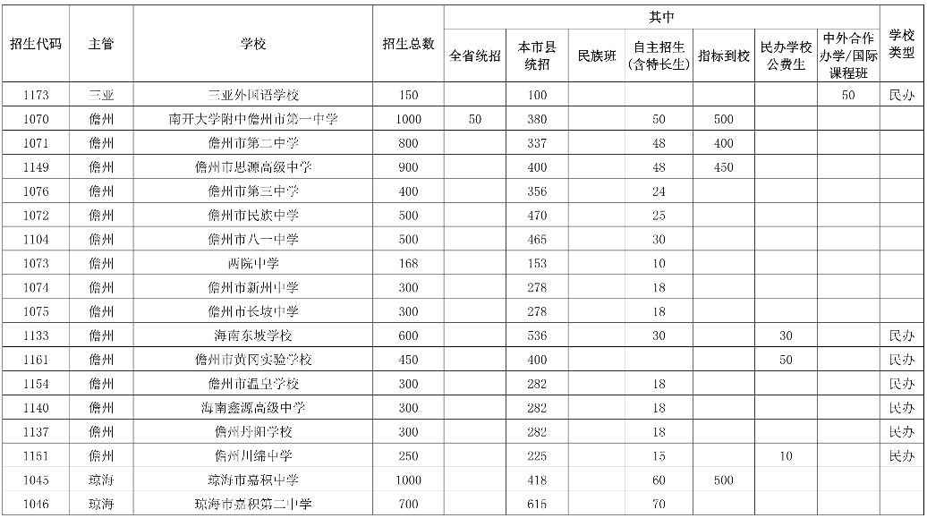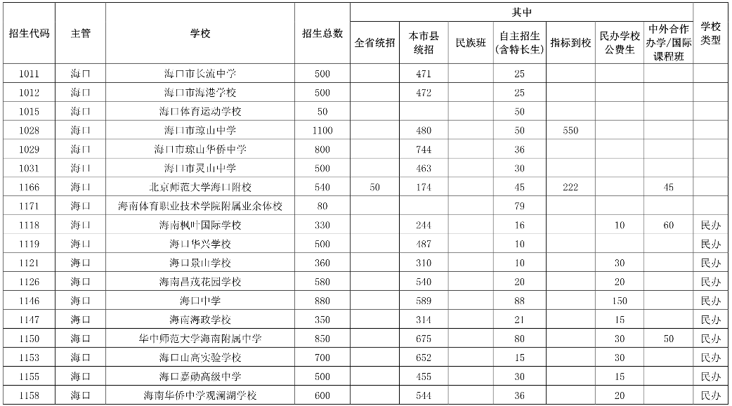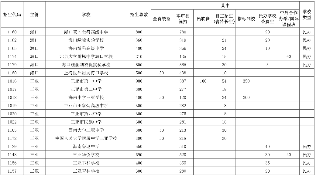 海南普通高中學(xué)校招生核定數(shù)2021年6月16日,海南省教育廳印發(fā)《關(guān)于下達(dá)我省2021年五年一貫制高等職業(yè)教育和高中階段教育招生計(jì)劃及做好招生入學(xué)等相關(guān)工作的通知》。據(jù)了解,2021年海南中考123884名考生報(bào)名,海南省普通高中招生計(jì)劃為68844人,其中海南中學(xué)計(jì)劃招生1258人(比去年增加318人),全省統(tǒng)招413人(比去年減少342人);海南華僑中學(xué)計(jì)劃招生1420人,全省統(tǒng)招92人。2021年新增5所高中學(xué)校招生,其中公辦3所(上海世外附屬海口學(xué)校、瓊海中學(xué)、文昌學(xué)校),民辦2所(定安縣山高高級實(shí)驗(yàn)中學(xué)、海南微城未來教育學(xué)校)。
