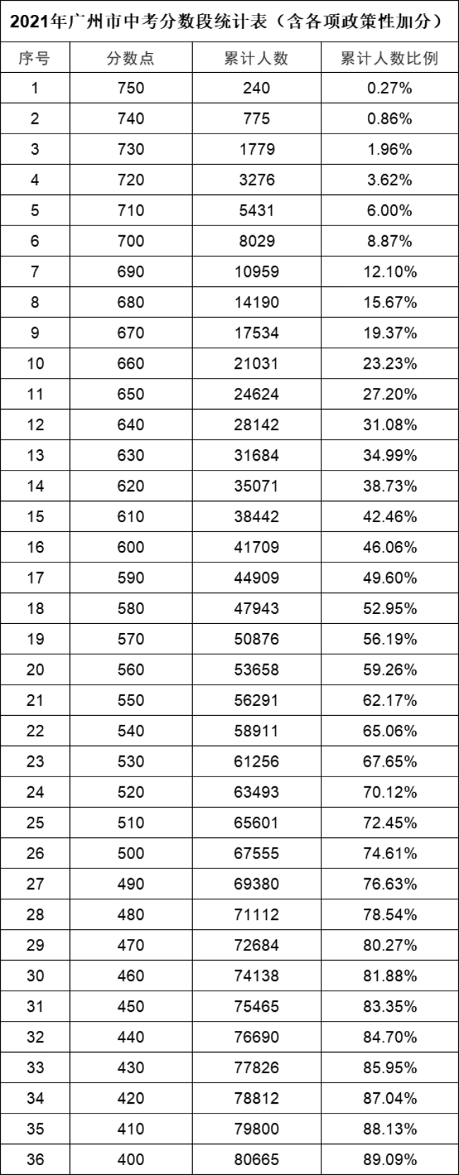 2021年廣州市中考分數(shù)段統(tǒng)計表(含各項政策性加分)