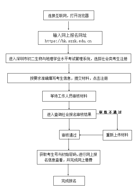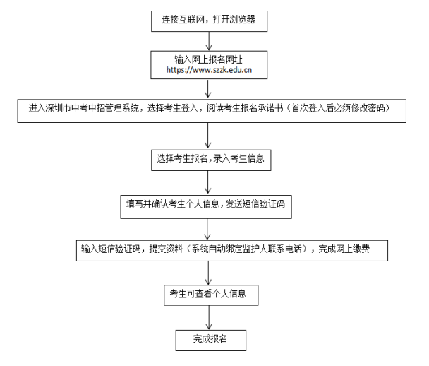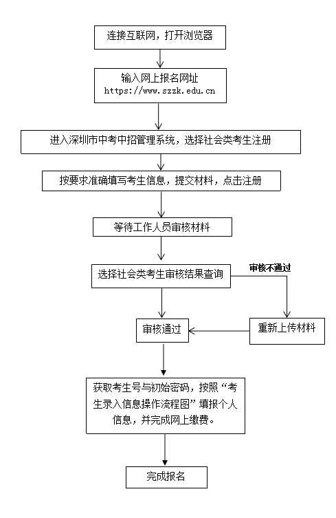 社會類考生采用網(wǎng)上報名方式進行報名。報名考生須在4月18日至24日登錄報名網(wǎng)址(中考報名網(wǎng)址:https://www.szzk.edu.cn,初二學考報名網(wǎng)址:https://hk.szzk.edu.cn),按照提示進行網(wǎng)上注冊,上傳報名審核資料,由考生戶籍所在區(qū)社會報名點進行線上審核,審核通過后系統(tǒng)將生成考生號及初始密碼,考生需用獲取的考號及密碼登錄中考中招管理系統(tǒng)或初二生物與地理學業(yè)水平考試管理系統(tǒng),填寫個人信息,具體操作可參考“考生錄入信息流程圖”。報名及繳費截止時間為4月24日下午6時。
