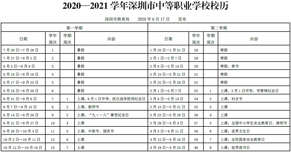根據(jù)《廣東省教育廳關(guān)于制定中等職業(yè)學(xué)校校歷有關(guān)事宜的通知》(粵教職函〔2018〕97號),結(jié)合我市實(shí)際,我局制定了《2020-2021學(xué)年度深圳市中等職業(yè)學(xué)校校歷》(以下簡稱校歷,見附件),現(xiàn)將有關(guān)事項(xiàng)通知如下: