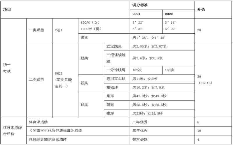 答:體育考試項(xiàng)目由以往的必考項(xiàng)目二選一、選考項(xiàng)目五選一,改為一類(lèi)項(xiàng)目中長(zhǎng)跑和游泳二選一,二類(lèi)項(xiàng)目跳類(lèi)、投類(lèi)、球類(lèi)八選二。2021年和2022年考試項(xiàng)目和標(biāo)準(zhǔn)如下: