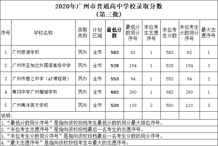 2020年廣州市普通高中第三批招生學(xué)校錄取工作于8月17日進(jìn)行,現(xiàn)將錄取分?jǐn)?shù)公布如下