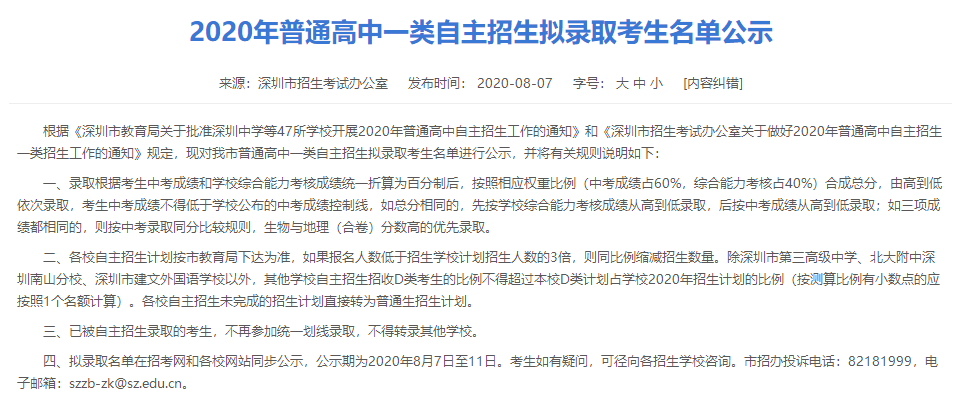 四、擬錄取名單在招考網(wǎng)和各校網(wǎng)站同步公示,公示期為2020年8月7日至11日。考生如有疑問,可徑向各招生學(xué)校咨詢。市招辦投訴電話:82181999  電子郵箱:szzb-zk@sz.edu.cn